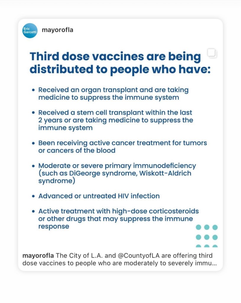 According to the mayorofla IG account the The City of Los Angeles and the county of Los Angeles are offering third dose vaccines to people who are moderately to severly Immunocompromised.