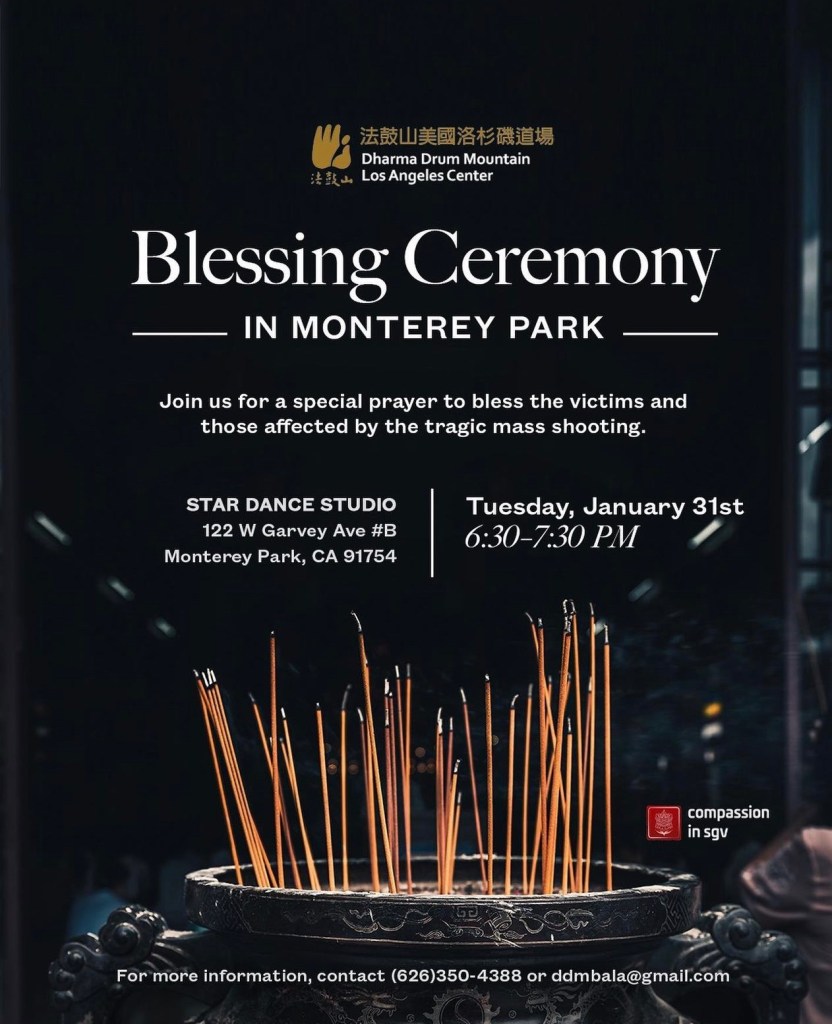 On January 31, 2023 the Dharma Drum Mountain Los Angeles Center (DDMLAC) will be co-hosting a ceremony in Monterey Park to bless the victims and those affected by the recent mass shooting at Star Dance Studio. The purpose of this event is to offer a space for processing this tragedy through the Buddhist tradition, which holds significant cultural and religious importance to the Monterey Park and San Gabriel Valley communities.